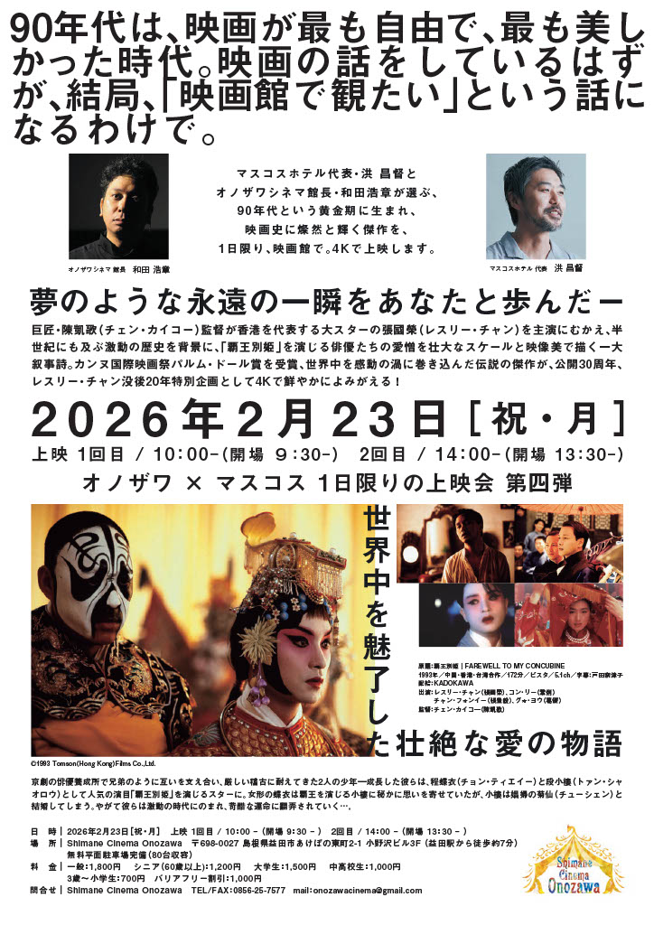 2月23日(祝・月)に、カンヌ国際映画祭パルム・ドール賞を受賞した映画史に残る伝説の傑作「さらば、わが愛/覇王別姫」を上映します!